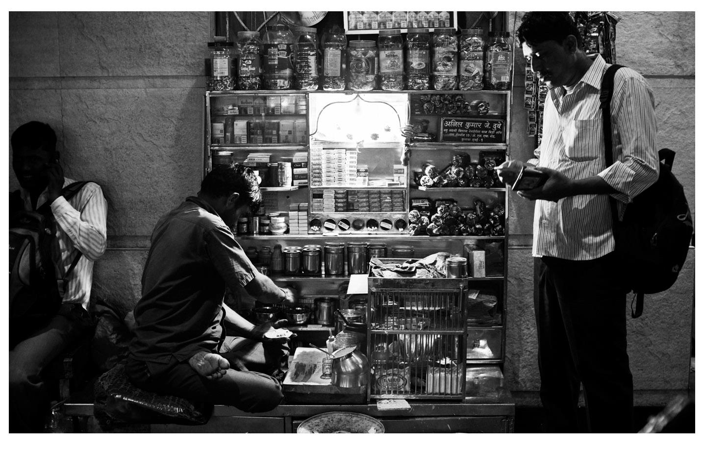 Streetside vendors sell seemingly everything at almost all hours of the day in Mumbai. This particular dutifully-managed cart offers a variety of tobbacco products and late-night snacks.