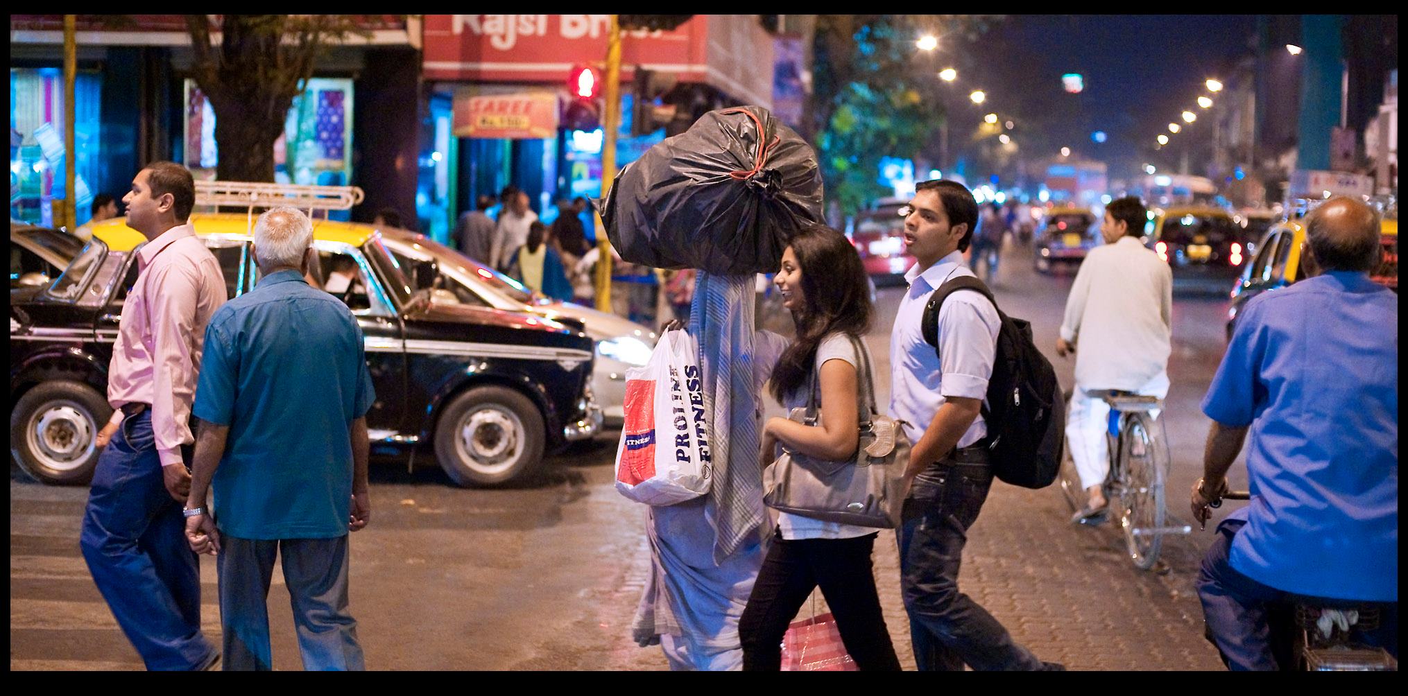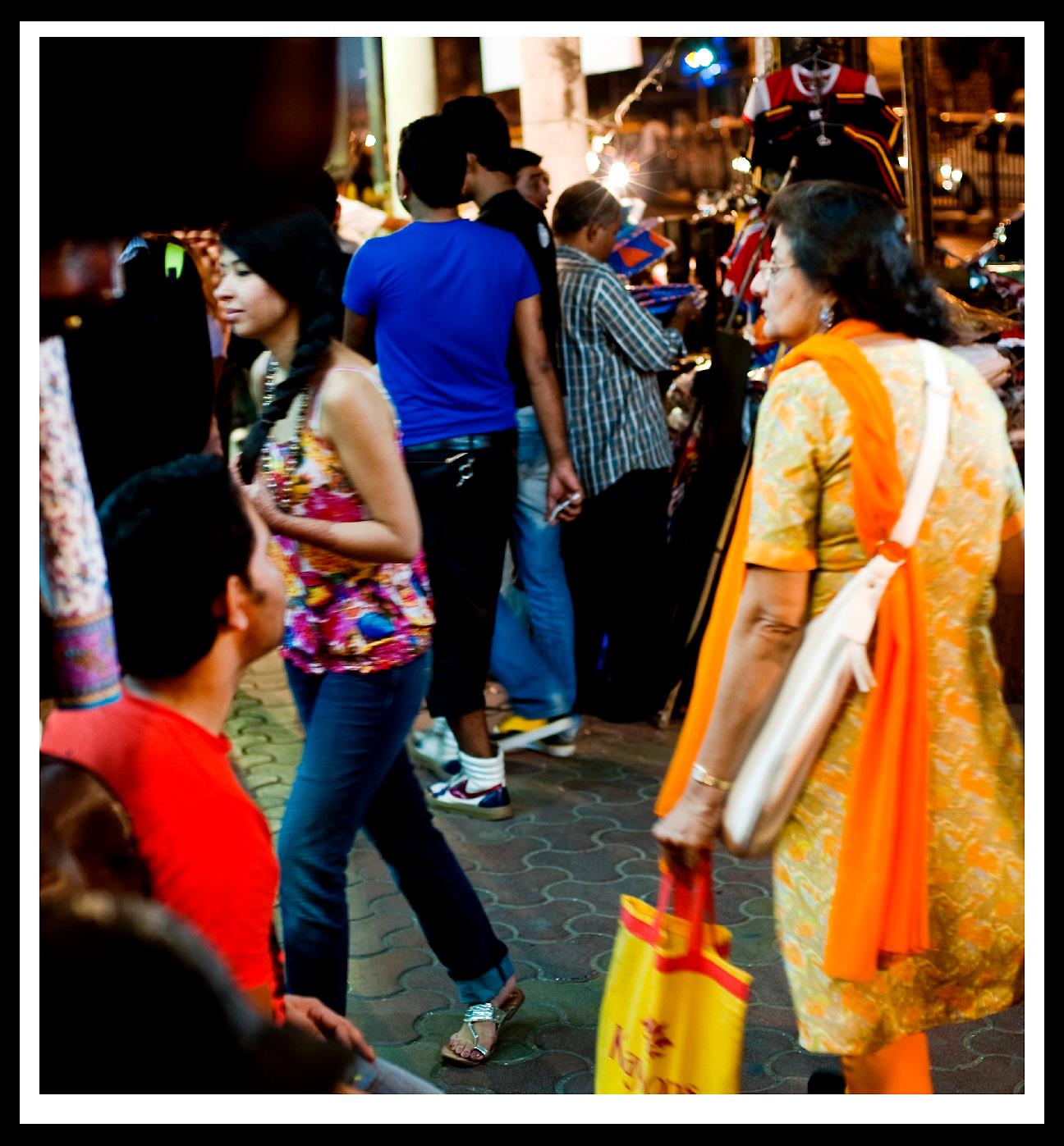 Evening shoppers criss-cross the street in Mumbai.