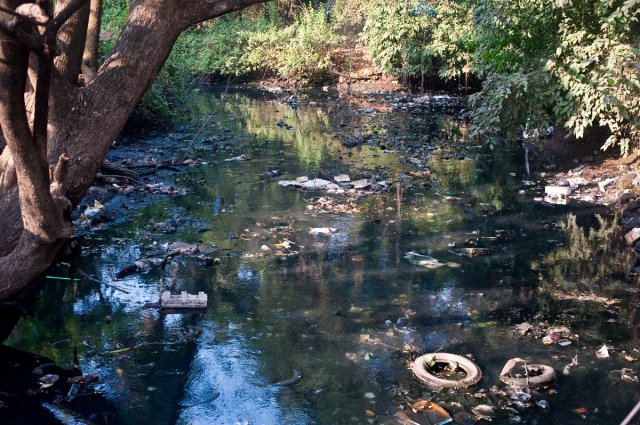 Pollution is a serious issue in modern India directly impacting human health via drinking water. This river in Goa is littered with tires, bottles and the distinct sheen of motor oil.