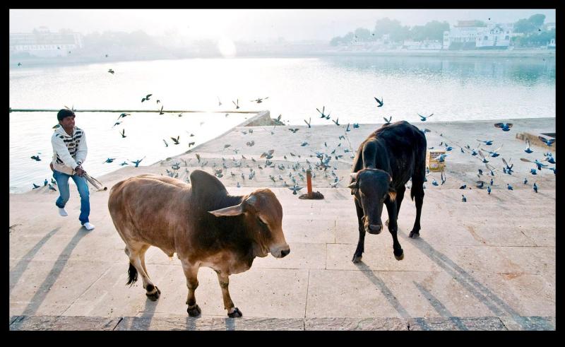 A man shoos cattle by the holy bathing waters of Pushkar Lake in Rajasthan.