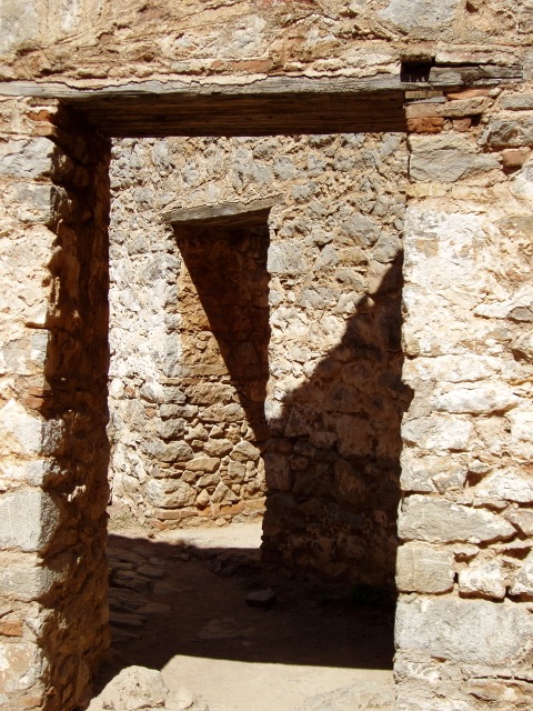 The Palamidi, in part because it rises nearly a thousand meters above the town, demands to be visited, or climbed, even, by means of its seventeenth-century staircase. Corey managed it under his own six-year-old steam, but Evan required carrying much of the way. The time to ascend is morning, while the staircase lies in blessed shade. Above, in gleaming sunshine, the ruin sprawls out in all directions, though “ruin” is perhaps not quite the word. “Abandoned” might do better. The Palamidi was a working fortress, and remains surprisingly intact. The prison wing is especially well preserved, with rooms and doorways and windows, some of which retain the original gratings and bars. At least two dungeon passages descended down stairs into unknown depths. Even with Corey’s sharp eyes and my camera flash, we have no idea how far onward those tunnels led.
