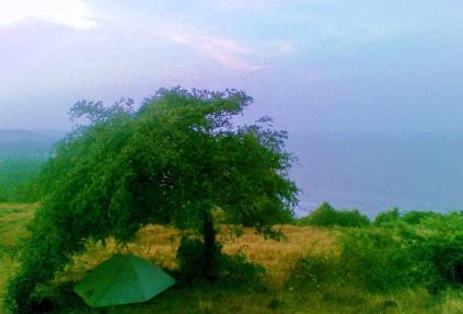I moved my tent to a mountaintop cherry tree. Its branches drooped to the ground, which hid me completely, yet let me survey. Unending ocean waves crashing rolling booming far below, slow and timeless beneath the frantic sprint of the djimbe-drummers; prancing prehistoric shapes illuminated by bonfire.