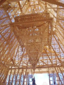 During Burning Man, however, the endless expanse of what is known as the playa becomes a canvas for a city to be constructed from scratch. Five square miles are enclosed within a boundary fence in a pentagon shape. Within that, a street grid is marked off in a huge semicircle, complete with numerical and alphabetical street signs. Hundreds of porta potties are brought in, and a center camp is built in the middle of the arc, at the edge of the expansive desert. Finally, the Man is built at the center of everything–an effigy on a platform that reaches 100 feet into the air, a landmark that can be seen from any point in Black Rock City. During this time, the open space of the playa begins to be populated by more and more installations of artwork, ranging from authentic-looking sunken ships rising out of the dust to flaming wheels of metal and fire to psychedelically neon works of light to a wooden temple of mind-blowing intricacy and grace.