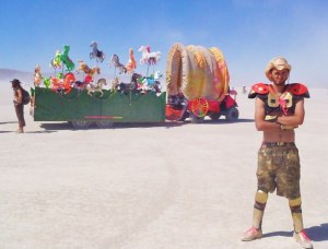 Then the people arrive. This year, there were more than 53,000 of them. Burners come in all types, but they all share a few things in common–a dedication to the 10 Principles of the event. These commandments center around inclusion, decommodification, self expression, self reliance, and participation. Tens of thousands of people show up in the desert and build their own city of tents and geodesic domes and shade structures, to share in art and music and absurdity. There is no electricity or water other than what is provided by participants bringing their own generators and containers. Everything is built or brought by the citizens–radical self-reliance in practice. These are creative, passionate people, wearing outrageous costumes or nothing at all, and it’s obvious that this is no normal city they create. Theme camps spring up, stages for DJs are erected, the art multiplies. Normal cars are forbidden from driving around BRC, and most people rely on bicycles for transportation around the streets or the open desert. However, pre-registered “mutant vehicles” are permitted to drive around the event, leading to an abundance of artistic mobile creations. Most shoot fire, have huge sound systems, or both, and they range in size from modified golf carts to double or even triple-decker buses. Almost all of them light up with electroluminescent wire or other bright lights at night, and become moving parties overflowing with revelers. Throughout the festival and the rest of the year, this crazy scene is what everyone calls “home.”