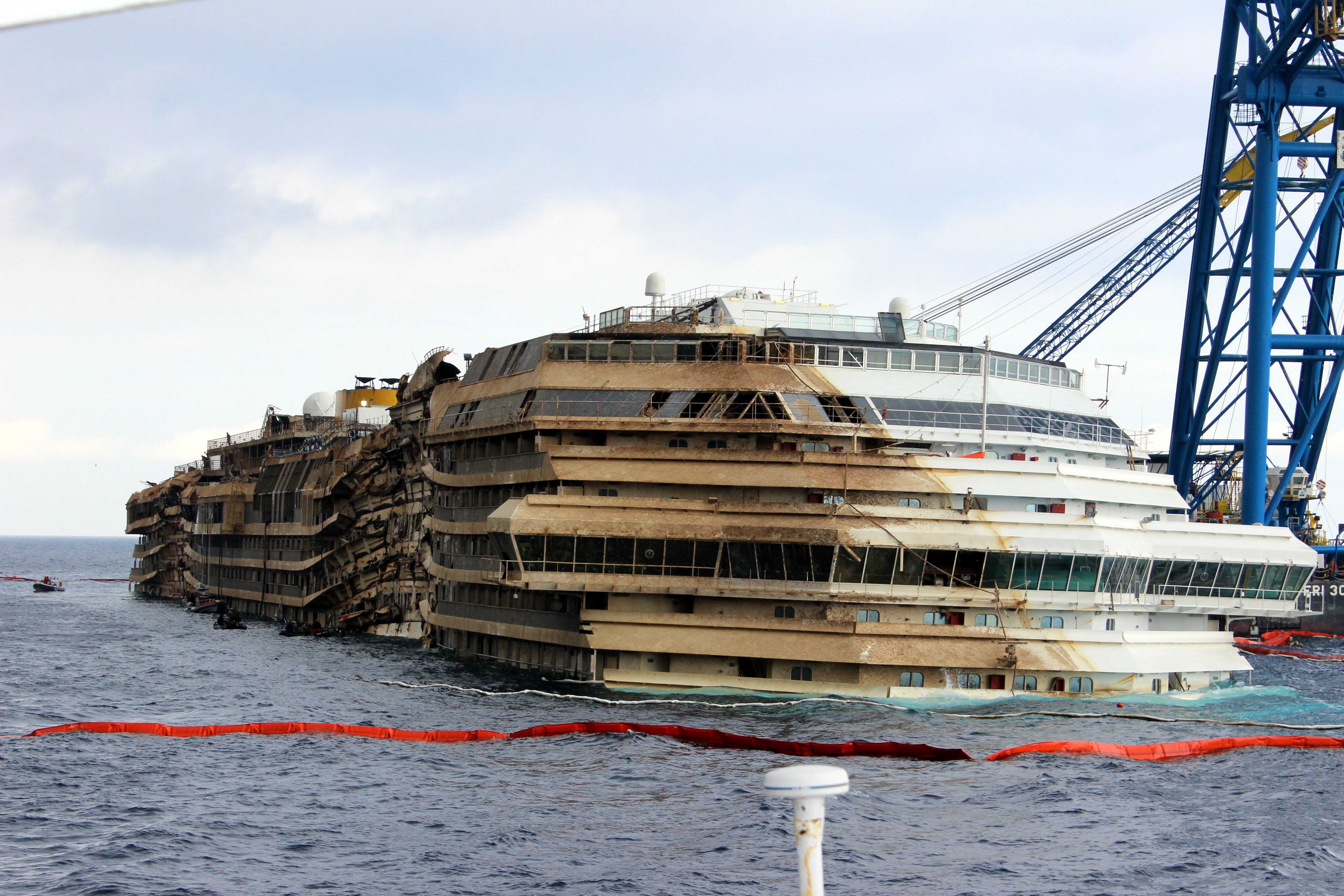 The surrounding area boomed from her new reality as a coastal construction site. Eleven days earlier, engineering crews completed a historic parbuckling operation to right the ship, which had been stranded sideways off the island’s coast for nearly twenty months. From afar, the towering machinery and industrial barges diminished her presence, replacing the enormity of what happened with the technicality of salvaging the pieces. The way they swarmed, everyone wanted a piece of her. Yet, as we closed in on the port, only a football field away from the wreckage, her magnitude hovered over all of us.