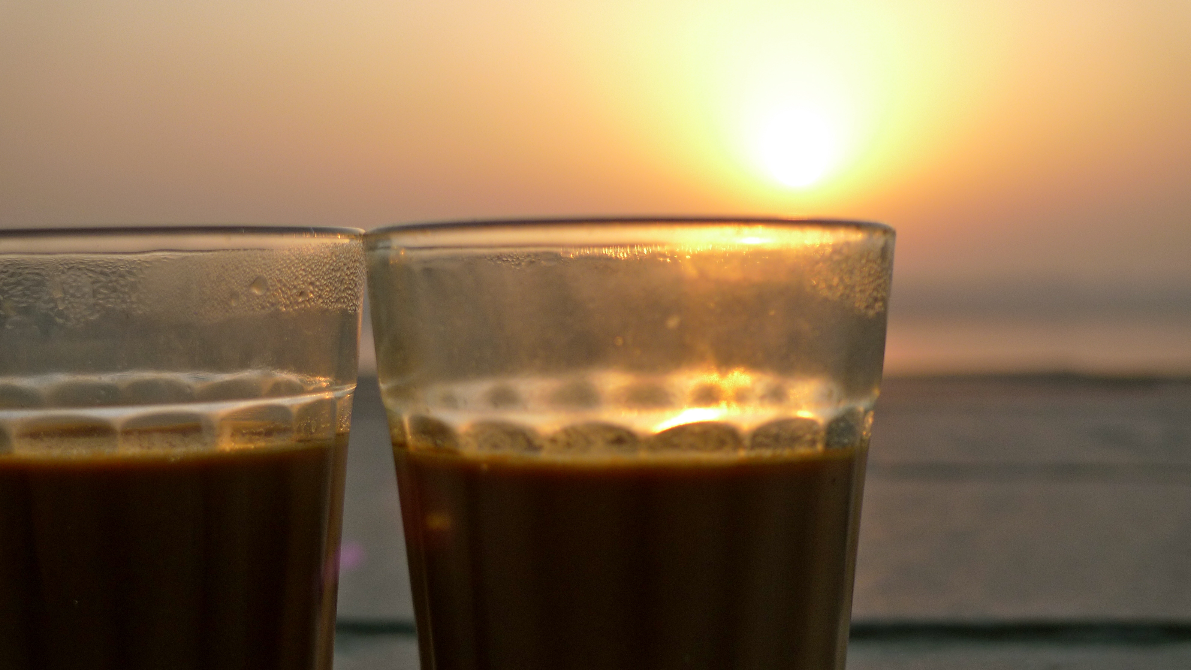 Dwayne holds his glass of chai gingerly with his fingers at the top of the glass because the glass is hot.