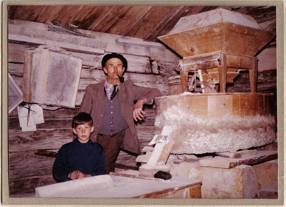 My grandfather was a miller. To my left there’s a framed photo of him and me standing inside the old wooden mill. He was also a carpenter and farmer, raising crops and keeping cows, sheep and goats. A black beret is pushed back over his high forehead, a pipe droops from the corner of his mouth, and he’s wearing a faded brown, three-piece suit, not quite matching. His black and white polka dot tie is skew. He’s leaning against the grinding mechanism with his elbow. I notice his hand looks very much like mine does now. He has that confident and dignified look of a peasant who has worked hard his entire life, proven himself, braved many storms, and achieved respect, honor and standing in his community. I was five at the time the photo was taken – wearing a black turtleneck and look serious, like my grandfather.